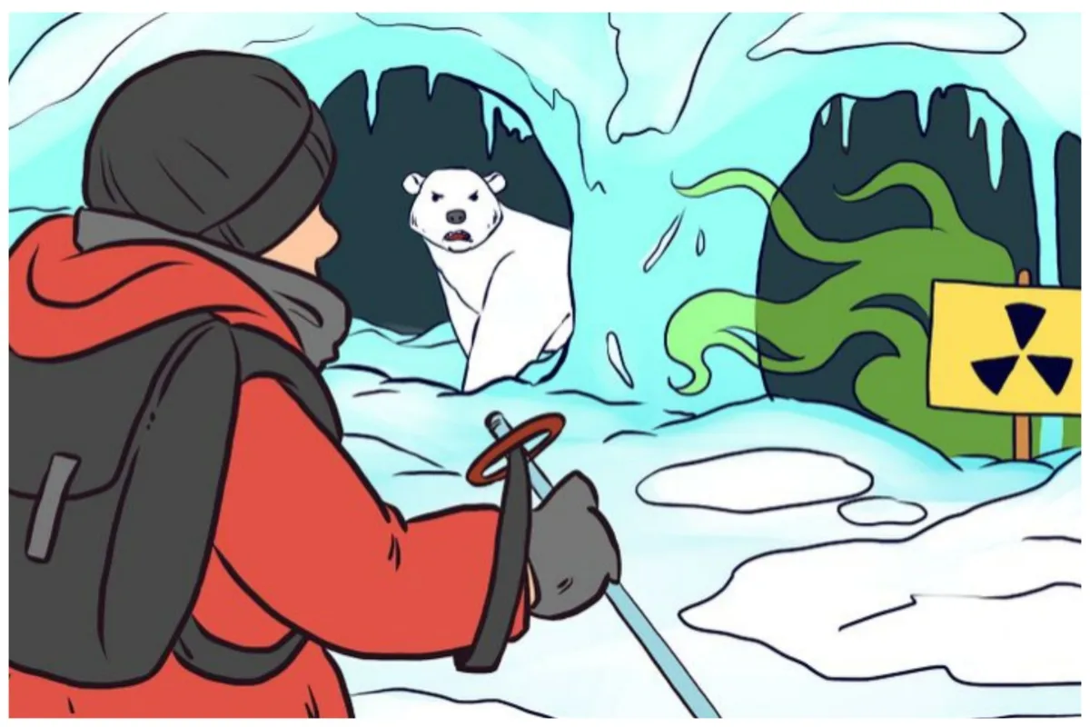 مردی در حال کاوش در قطب جنوب بود که طوفانی شدید شروع شد. او موفق شد دو غار را پیدا کند که بتواند در آن پناه بگیرد، اما متوجه شد که یک خرس قطبی گرسنه در یکی از غارها حضور دارد و غار دیگری پر از زباله های رادیواکتیو است. کدام غار را انتخاب می کند؟