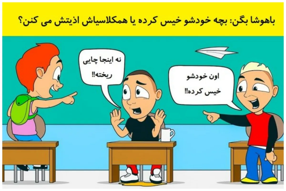 در یک کلاس درس 3 دانش آموز دیده می شوند.دو تن از دانش آموزان در حال مسخره کردن یک دانش آموز هستند. گویا او خودش را خراب کرده است. این دو حسابی در حال خندیدن هستند. اما کودک دیگر از این قضیه ناراحت شده و می گوید که روی زمین و زیر نیمکت چای ریخته شده است. به نظر شما کدامیک درست می گویند؟