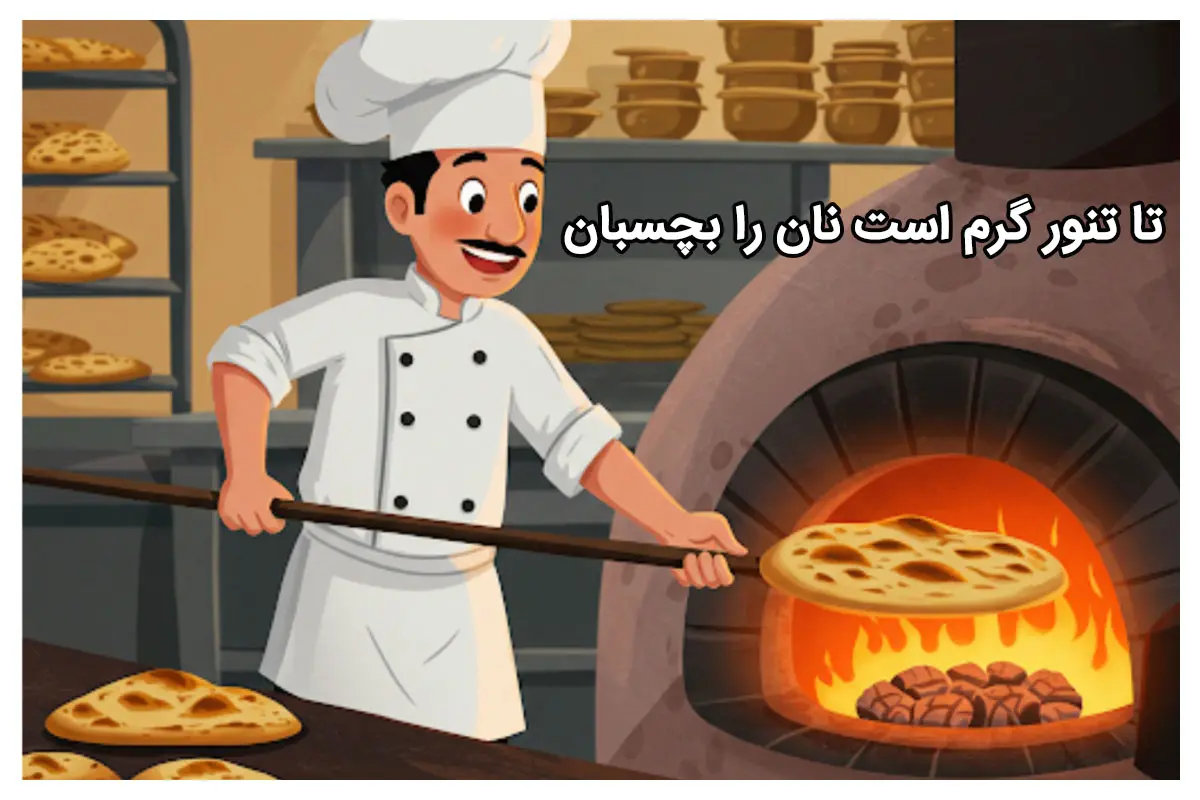 آیا تا به حال به نانوایی رفتهاید؟ حتماً دیدهاید که نانوا چقدر سریع و ماهرانه کار میکند. او خمیرهای آماده را به سرعت داخل تنور داغ میگذارد و نانهای تازه و خوشمزه بیرون میآورد. حالا تصور کنید اگر نانوا صبر کند تا تنور سرد شود، آیا میتواند نان خوبی بپزد؟ قطعاً نه! بنابراین اگر او به موقع خمیر نان را به تنور نچسباند، حرارت تنور کم میشود و نانها به خوبی پخته نمیشوند. پس او باید از فرصتی که فراهم شده، به بهترین شکل استفاده کند.