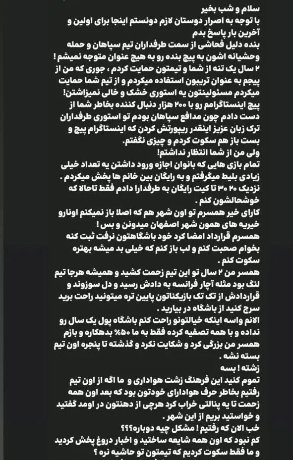 بنده دلیل فحاشی از سمت طرفداران تیم سپاهان و حمله وحشیانه اشون به پیچ بنده رو به هیچ عنوان متوجه نمیشم! ۲ سال یک تنه از شما و تیمتون حمایت کردم. جوری که من از پیجم به عنوان تریبون استفاده میکردم و از تیم شما حمایت کردم مسئولینتون یه استوری خشک و خالی نمیزاشتن! پیچ اینستاگرامم رو با ۲۰۰ هزار دنبال دنبال کننده بخاطر شما از دست دادم چون مدافع سپاهان بودم. تو استوری طرفداران ترک زبان عزیز اینقدر ریپورتش کردن که اینستاگرام پیچ رو بست. باز هم سکوت کردم و چیزی نگفتم.